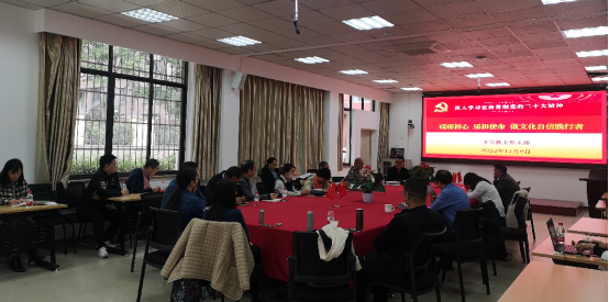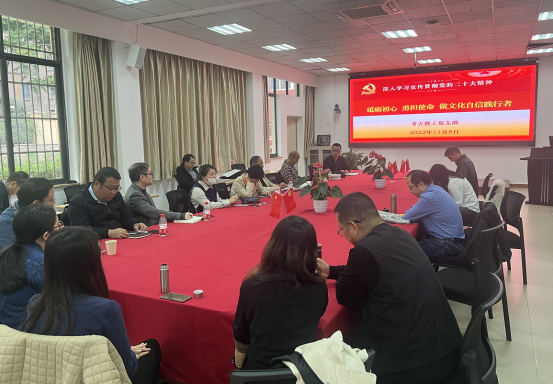 作为高校从事文化工作的基层党组织,大家集中对“二十大”报告进行了认真研读,关注到“二十大”报告中“文化”一词整整出现了三十次,关系到“社会主义先进文化”、“文化自信”、“文化安全”等热词,感受到党和国家对“文化”的高度重视,倍感鼓舞。