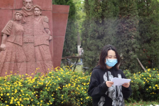 “松柏挺立,丰碑永存,革命精神,薪火相传。”博士支部入党积极分子郭文静和胡天鹏同学表达了对革命先烈的追思。他们表示,作为新时代的建设者,我们一定传承和发扬革命先辈的奋斗精神,牢记历史,双肩担使命,心头记责任,刻苦钻研,为新世纪祖国建设贡献力量。