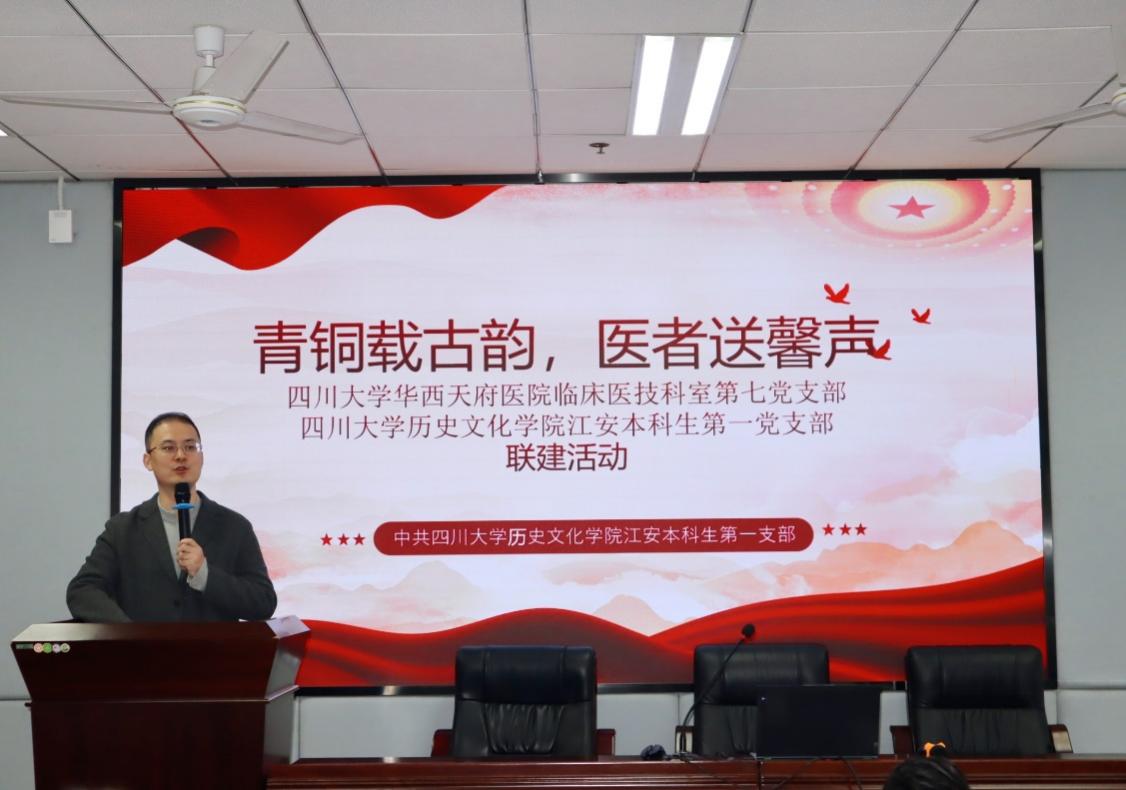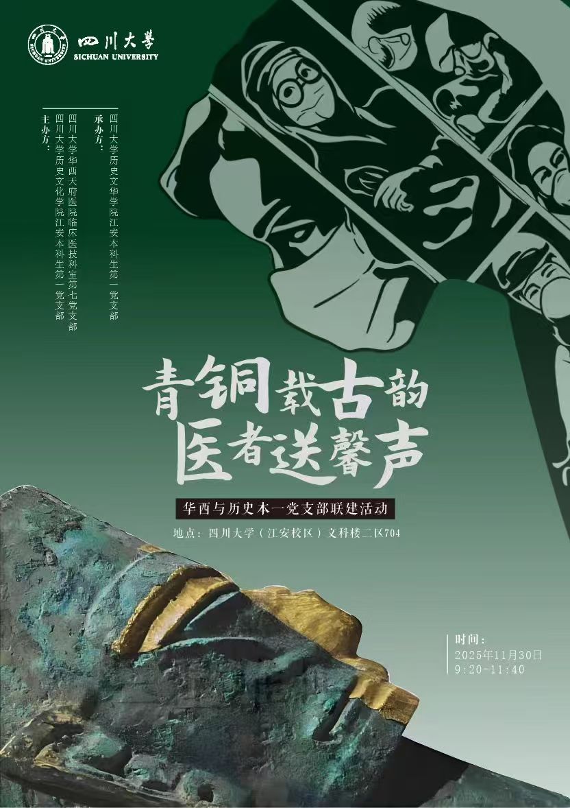 2025年11月30日上午,由四川大学华西天府医院临床医技科室第七党支部与历史文化学院江安本科生第一党支部联合主办的“青铜载古韵,医者送馨声”联建共学活动在江安校区文科楼二区704报告厅顺利开展。华西专家、历史学院师生共计60余人齐聚一堂,以“党建+学术+健康”的跨界融合模式,共赴一场跨越三千年文明与当代医学温度的对话。