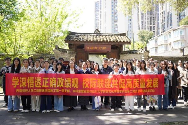 为扎实开展树立和践行正确政绩观学习教育,加强校际基层党组织交流互鉴,2026年3月31日,西南财经大学工商管理学院教工第一党支部、本科生党支部与四川大学历史文化学院本科生第二党支部、2023级硕士生第二党支部在四川大学望江校区联合举办“学深悟透正确政绩观,校际联建共促高质量发展”主题联建共学活动。