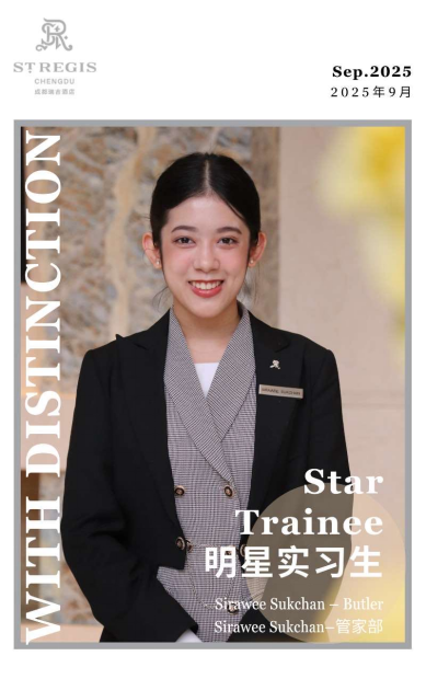 While interning in the Butler Service team at The St. Regis Chengdu, SIRAWEE SUKCHAN impressed both department leaders and guests with her warm, sincere attitude and highly professional performance. She actively integrated into the team, diligently studied and mastered the procedures and standards of St. Regis butler service, and consistently paid close attention to the personalized needs of different guests. In areas such as daily reception, room preparation and special arrangements, she refined service quality through careful attention to detail. She always strove to anticipate guests’ needs and respond before they even had to ask, including recording the preferences of long-stay guests and designing thoughtful surprises for special occasions. Owing to her dedication and strong sense of responsibility, SIRAWEE stood out in The St. Regis Chengdu’s “Star Employee” selection in September 2025 and was awarded the title of “Star Intern.” This honor carries significant weight within the hotel, signaling the management’s full recognition of her internship performance and highlighting the ability of Sichuan University students to adapt quickly, communicate effectively and uphold service standards in frontline positions at international luxury hotels.
