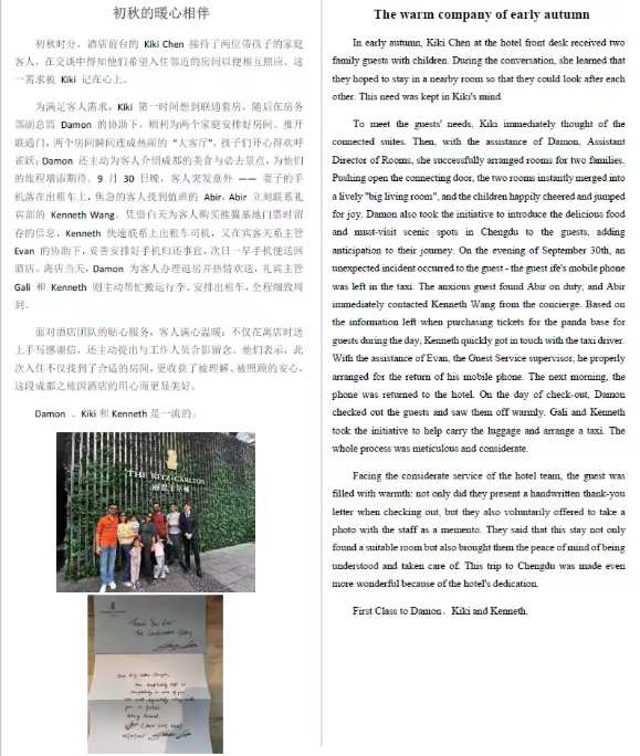 During his internship in the Concierge Department at The Ritz-Carlton, Chengdu, KENNETH AARWEN HALIM earned the trust and recognition of guests and colleagues through his attentive service. On 30 September 2025, a guest accidentally left her mobile phone in a taxi and became extremely anxious. Drawing on the information he had carefully recorded earlier while assisting the guest in purchasing tickets, KENNETH reviewed the relevant details and worked closely with colleagues to successfully retrieve the phone. Grateful for this help, the guest wrote a handwritten thank-you letter and took the initiative to invite KENNETH and other staff members to take a group photo (please see Figure 1). This heartwarming story was later selected to be featured in an internal newsletter of The Ritz-Carlton. KENNETH’s strong sense of responsibility, professionalism and genuine care for guests vividly embody The Ritz-Carlton’s service philosophy of “We are Ladies and Gentlemen serving Ladies and Gentlemen,” and also reflect the solid outcomes of the School’s efforts in cultivating high-end hospitality talent with cross-cultural competence.