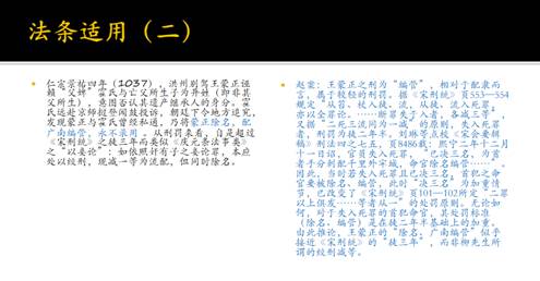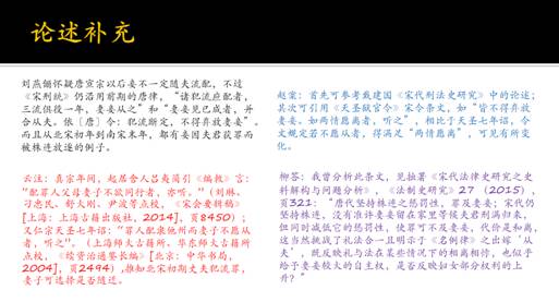 在拟定修订方案并得到学生的同意后,他们师生三代人对柳著的修订讨论就开展起来了。这一过程历经一年有余,最终以“云注”(云梦沙补注)、“赵案”(赵晶案语)、“柳答”(柳立言回答)的方式在新版的脚注中予以呈现。在讲座中,赵先生从学术史判断、史料断句、史料解释、法条适用、论述补充、思维发散等若干方面,展示了他们师生三代学人之间的互动,从中我们又可以得到一些精读名著的好办法。