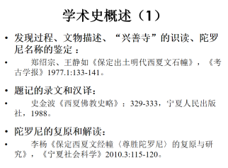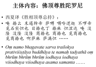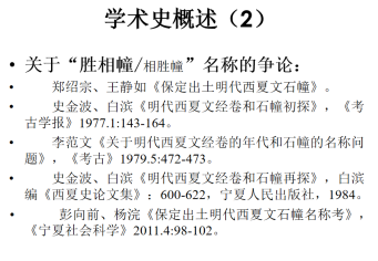 聂先生在简单交代了这两座经幢的形制、内容后,进一步从研究史的角度回顾了前人对经幢的发现过程、文物描述、对“兴善寺”三字的成功识读和对陀罗尼名称的鉴定,对题记的录文和大致汉译,对陀罗尼的复原和解读,以及现代一些学者关于幢题名称是“胜相幢”还是“相胜幢”的争论及其解决情况。从先生展示的这两页PPT来看,尽管这两个经幢纪念的两位僧人名气不大,但却吸引了包括王静如、李范文、史金波、白滨等顶级学者在内的数代西夏学学者的长期关注和持续探究,从中既可见这两座西夏文经幢的重要价值,也反映出一些学术问题的复杂性和学者探究时精益求精的学术精神,对听者是很大的震撼。