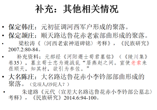 正如莅临讲座的刘复生教授所指出的,这个“补充”相当重要,因为我们在听聂先生讲述这个发生在韩庄的“故事”时,不能不生发一个问题:除了韩庄以外,附近还有没有其他的党项人聚落呢?这个“补充”正好说明,在西夏亡国之后,党项人外迁不少,就在河北地区还有保定颉庄、大名陈庄这样的党项人聚落。这些拱卫都城北京的党项人聚落的存在,是党项人进入内地生活后逐渐融入到中华民族共同体的历史见证,是我国民族交往、交流、交融史研究的一个重要论题。
