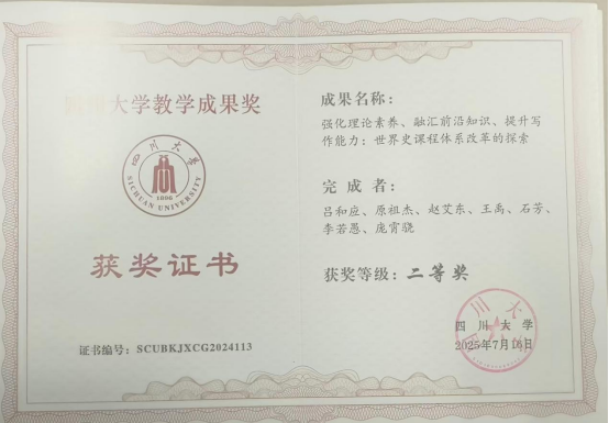 2025年7月16日,世界史系“强化理论素养、融汇前沿知识、提升写作能力:世界史课程体系改革的探索”成果荣获2024年四川大学教学成果奖二等奖。该成果历经6年实践检验,构建起了“理论—前沿—写作”三位一体培养体系,为世界史专业人才培养提供了高效路径。
