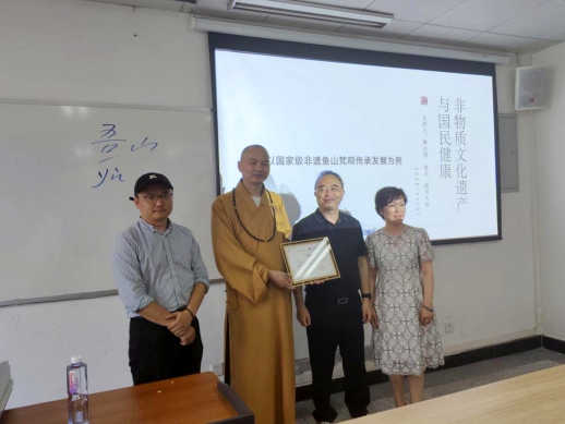 梵呗传承人释永悟以“鱼山闻梵”的故事开启讲座,带领大家回顾了鱼山梵呗从始创两千年来的兴衰历史到如今传承人们践行“复兴梵呗,生死与共”的理念、通过挖掘整理和保护传承、成为国家级非物质文化遗产的艰辛历程。释永悟指出,“梵是礼,更是道呗是乐,更是德;梵呗是儒家礼乐文明与道家道德文化浸润佛教进而中国化的优秀成果,是儒、释、道三家高度统一融合的中华文明优秀典范。鱼山梵呗借鉴礼乐文明的表现形式与道家文化的核心要义本着以和为贵、和而不同的包容精神,传承着梵呗反闻闻自性、净化身心灵、真善美慧生的道德教化功能与内涵。梵呗集礼乐文明与道德文化于一体,内修道德心性,外摄人伦秩序,内摄外化,相得益彰,共成天地之和(乐),人文之序(礼)。梵呗不是普通的转读唱诵,普通的唱诵不能代表鱼山梵呗传承体系‘声文两得’生命气息精神质,更不能代表天人合一、博大精深的中华文化内核的历史厚重。