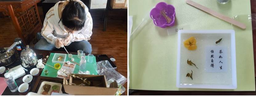 活动的尾声部分,同学们以茶为主题,结合当天参与活动的感受与心情,用水晶滴胶进行了手工创作,其中有的同学亲手将茶叶塑封在模具中,制作出精美的小摆件,将茶文化的艺术魅力永久封存。