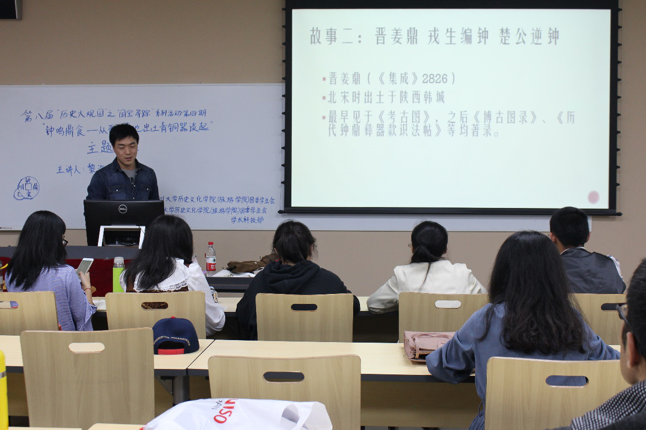 由四川大学历史文化学院(旅游学院)团委、学生会主办,四川大学历史文化学院(旅游学院)团委、学生会学术科技部承办的第八届“历史大观园”之“国宝寻踪”系列活动第四期“钟鸣鼎食——从晋侯墓地出土青铜器谈起”于2018年3月30日晚7:20在江安校区第一教学楼A座109教室成功举办。