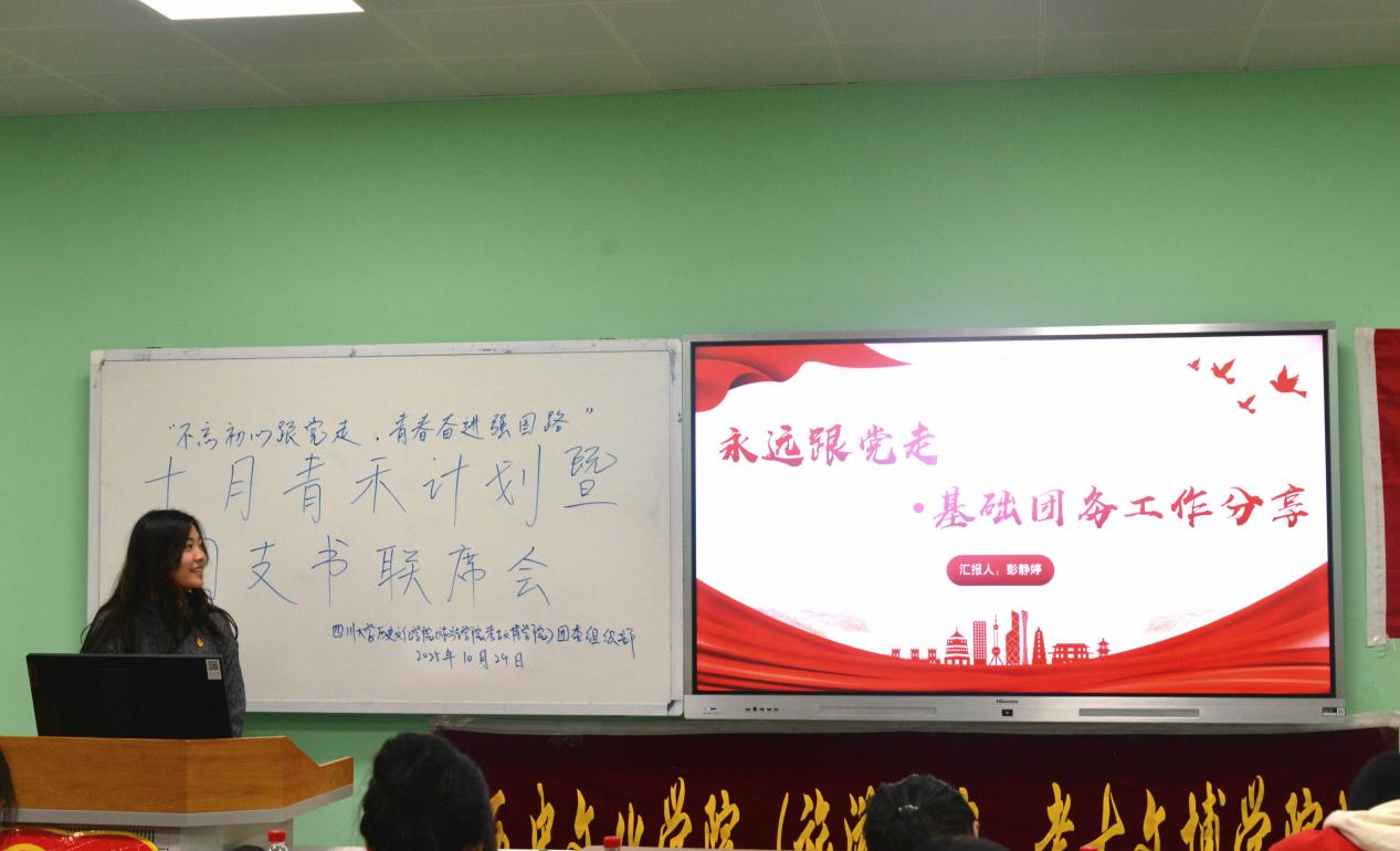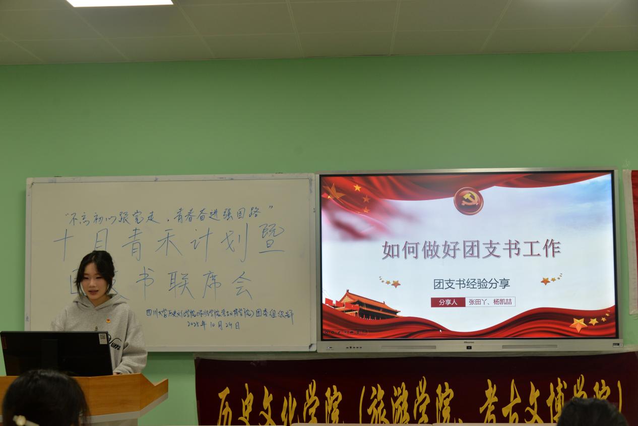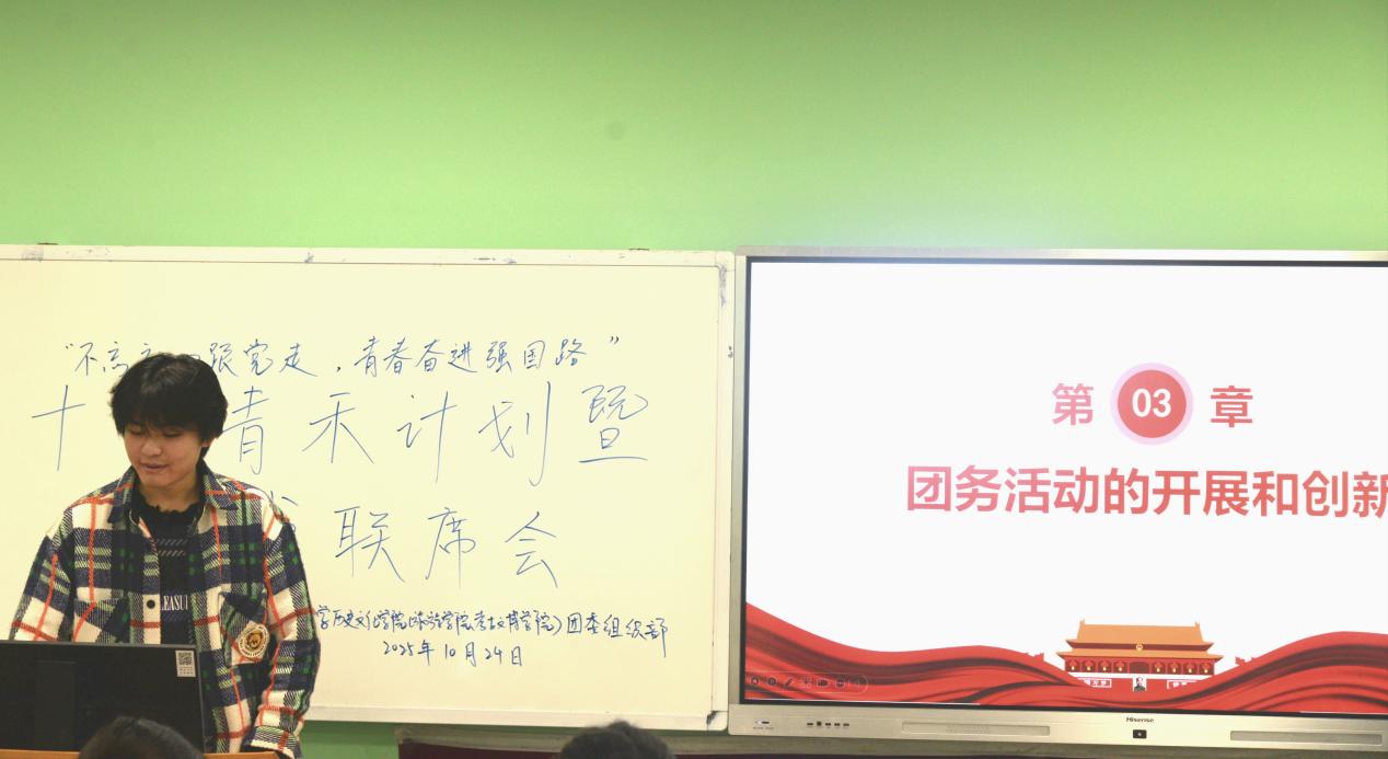 随后,2024级团支书代表彭静婷同学分享了校级“青禾计划”会议精神,并就基础团务工作如组织关系转接、推优入党、团员发展、教育评议等进行了介绍。