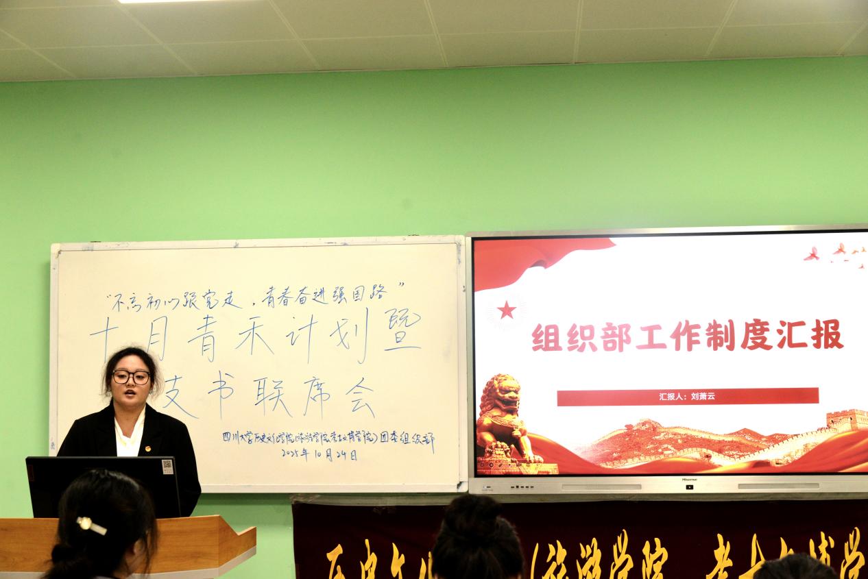 学院分团委组织部部长刘萧云同学汇报了部门工作制度,重点说明了主题团日抽查机制、“书声朗朗”读书活动及本期团校计划等内容。