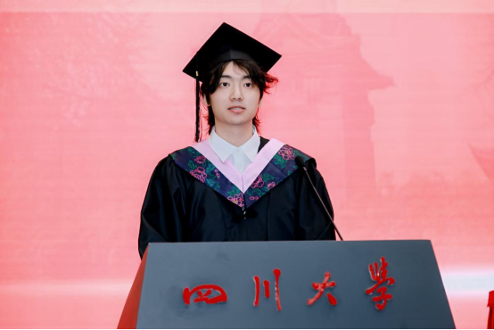 2021 级博士毕业生赵振中作为博士毕业生代表发言。他回忆2017年入学时的青涩憧憬,从迎新场景到开学典礼,勾勒出梦想起航的瞬间。谈及硕博七年,他感慨 “时间很长又很短”:长到总觉得有做不完的课堂汇报、写不完的课程作业,搜集不完的数据,修改不完的审稿意见……曾在文科楼通宵赶PPT,在导师指导下反复打磨申报书,从学术汇报时的紧张到从容应答……短在未及尝遍食堂窗口、踏遍校园角落便已迎来毕业。七年里,他深刻体会到川大 “海纳百川” 的氛围滋养着学子以惊人的速度成长,或是收获成果与爱情,或是在挫折中蜕变,又或是调侃着发际线后移、保温杯里的枸杞等,这些都是学子们成长的印记与“代价”。临别之际,他致谢母校栽培、师友陪伴,并以“鹏北海,凤朝阳,又携书路茫茫”,祝福母校如锦江奔涌,恩师学术长青,同窗跃入人海仍风雨灿烂。