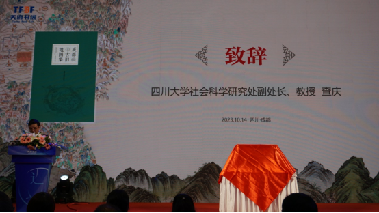 在首发式上,四川大学社会科学研究处副处长查庆教授代表四川大学致辞,对《成都古旧地图集》给予高度评价:“‘九天开出一成都,万户千门入画图’,成都是我国古蜀文明的发祥地,历史悠久,文化灿烂,作为一座悠久的历史文化名城,为了充分反映成都在中国历史上的重要地位,尤其是成都作为“南方丝绸之路”、蜀道、茶马古道、川江航道等水陆交通枢纽,在西南地区经济开发、边疆治理、民族融合等方面所发挥的重要作用。由四川大学历史地理研究所牵头,联合校内外相关单位,历时数年,共同编纂完成的《成都古旧地图集》具有重要的学术价值和现实意义。该图集编纂体例新颖,内容丰富,所收录的三百余幅古旧地图大部分都是第一次公开出版,为学术界、为成都人民奉献了一部优秀的文化精品成果,在此我代表四川大学向参与编纂的各位师生表示衷心祝贺!并真诚感谢帮助、支持《成都古旧地图集》编纂整理的各位专家学者!感谢出版单位成都地图出版社的辛勤付出!并期待更多的巴蜀古旧地图整理与研究成果的出版。”