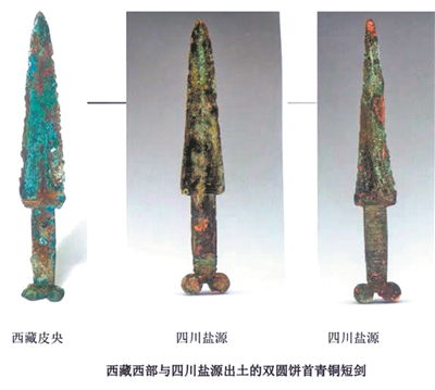 西藏西部与四川盐源出土的双圆柄首青铜短剑。