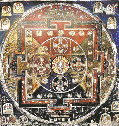 皮央东嘎石窟中的曼荼罗(坛城图)壁画局部。