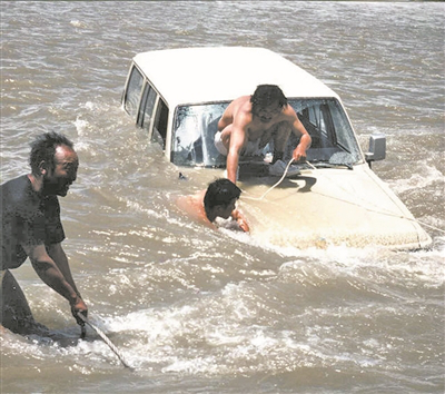1994年,考古队车辆坠河,霍巍(右)和李永宪(中)抢救落水的考古资料。