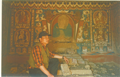 1992年6月,霍巍团队在阿里地区发现皮央东嘎石窟群。图为霍巍在考察石窟中的壁画。