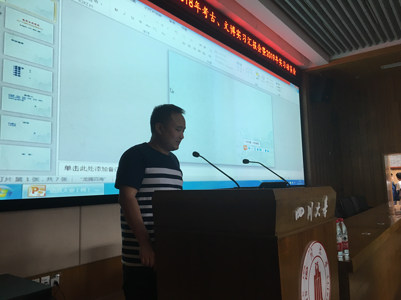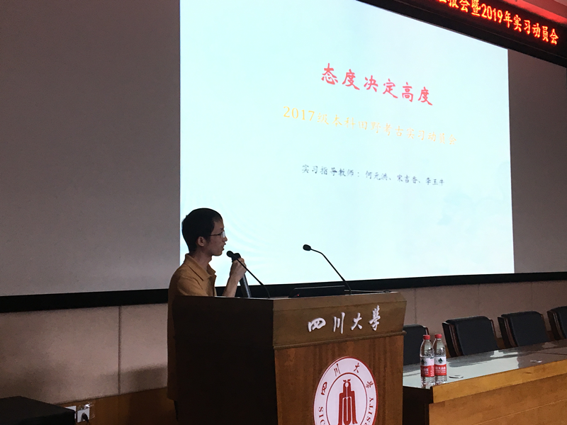 会议的第二个阶段是实习动员会。考古、文博专业三支实习队的带队教师及多位老师在实习即将开始之时为同学们动员鼓劲。2019年度海门口遗址考古实习队带队教师何元洪强调,态度决定高度,实习过程中要有责任心,讲究纪律,注意安全,责任心不仅指对遗址、遗迹、造物的发掘记录和整理,更多的也是对四川大学名誉的责任心。