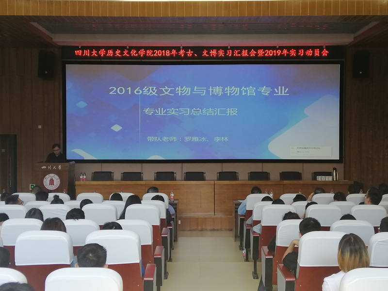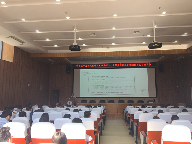 四川大学历史文化学院2018年考古、文博专业实习汇报会暨2019年实习动员会于9月25日下午在江安校区文科楼二区学术报告厅举行。历史文化学院院长霍巍教授、副院长鲍成志、副书记姜华、考古系十余位教师及2016级、2017级考古、文博专业全体本科生和部分研究生共计100多人参会。会议由考古系系主任白彬教授主持。