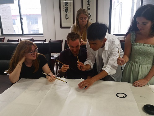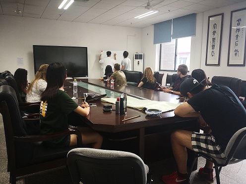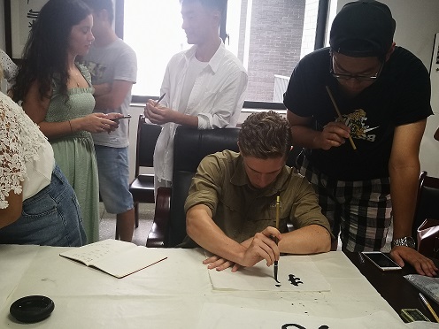 7月16日上午十点,我院国际交流营的同学们来到江安校区文科楼二区518参加毛笔书法课,亲身实践来体验中国传统书法文化的博大精深。