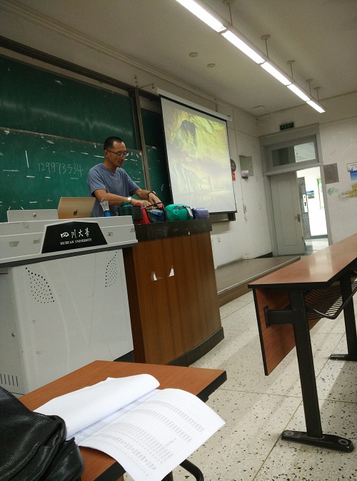 我院国际实践周“户外旅行产业发展现状及旅游突发事件应急救援”系列讲座是由樊龙智老师主讲。7月12日上午9:00,在江安校区一教B座107,樊老师着重在感性的方面向同学们解读了什么是户外运动,并携带户外装备到教室,认真讲解每个装备的作用,以及最主要的是哪几样,丰富大家的野外知识。