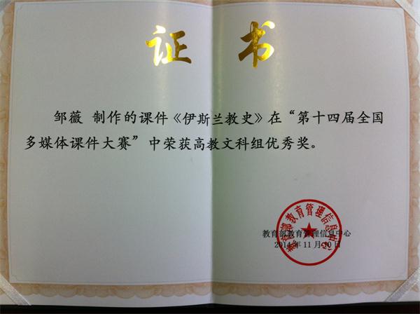 其中我院世界史教研室青年教师邹薇博士制作的课件《伊斯兰教史》在“第十四届全国多媒体课件大赛”中荣获高教文科组优秀奖。